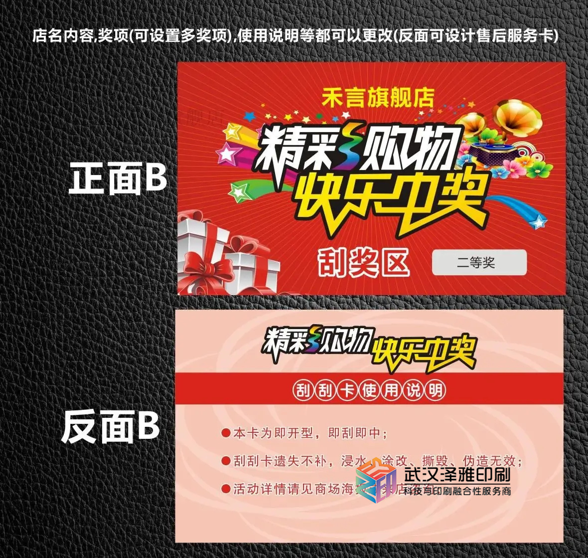 武漢澤雅印刷包裝公司真誠歡迎各地朋友以上是武漢刮刮卡,防偽代金券,刮刮卡印刷,刮獎卡制作,武漢刮獎卡,聯系洽談:18995659315如果你對我們的產品/服務有疑問,請聯系我們。